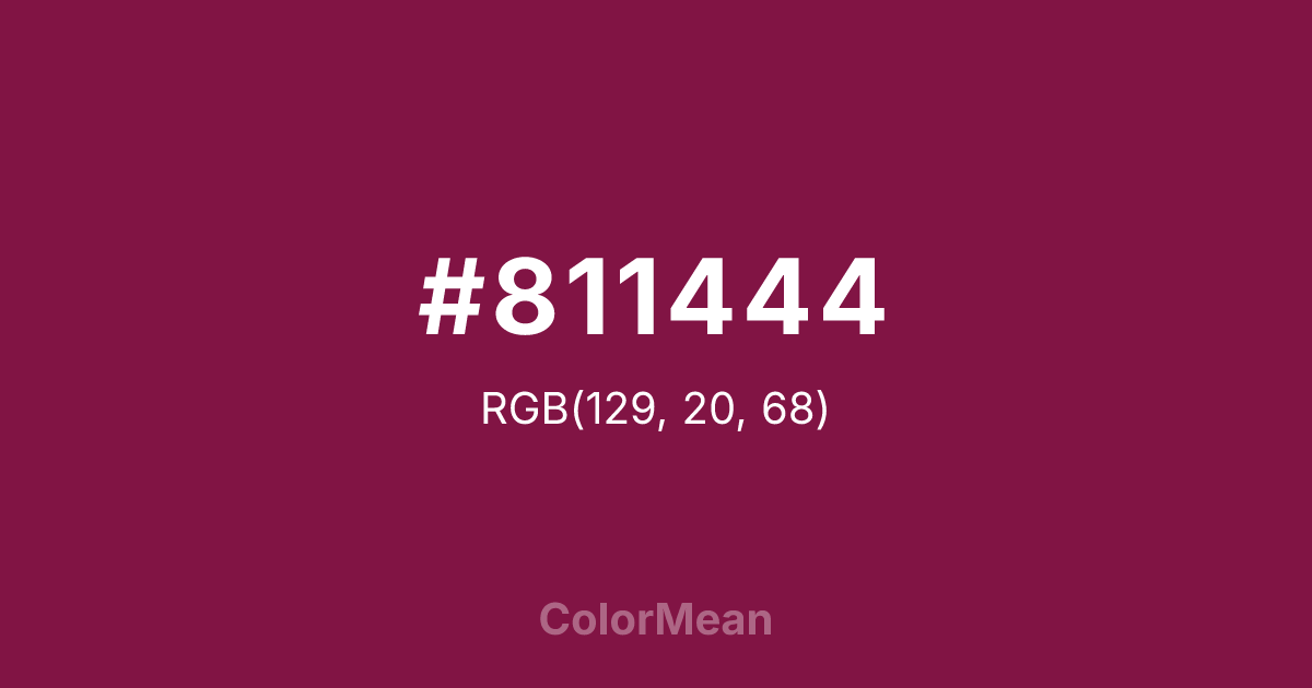 #811444 RGB value is (129, 20, 68). The hex color red value is 129, green is 20, and blue is 68. Its HSL format shows a hue of 334°, saturation of 73 percent, and lightness of 29 percent. The CMYK process values are 0 percent, 84 percent, 47 percent, 49 percent.