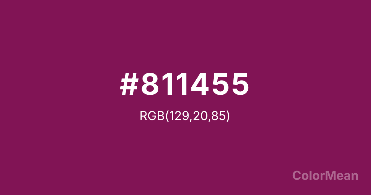 #811455 RGB value is (129, 20, 85). The hex color red value is 129, green is 20, and blue is 85. Its HSL format shows a hue of 324°, saturation of 73 percent, and lightness of 29 percent. The CMYK process values are 0 percent, 84 percent, 34 percent, 49 percent.