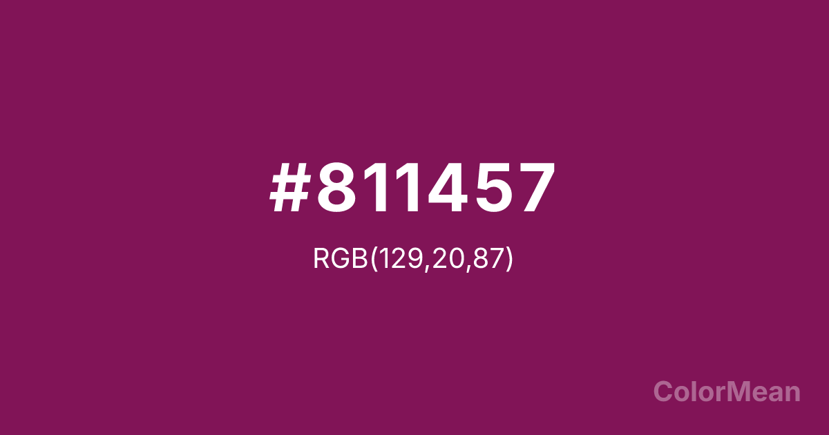 #811457 RGB value is (129, 20, 87). The hex color red value is 129, green is 20, and blue is 87. Its HSL format shows a hue of 323°, saturation of 73 percent, and lightness of 29 percent. The CMYK process values are 0 percent, 84 percent, 33 percent, 49 percent.