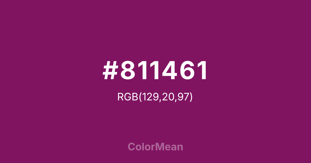 #811461 RGB value is (129, 20, 97). The hex color red value is 129, green is 20, and blue is 97. Its HSL format shows a hue of 318°, saturation of 73 percent, and lightness of 29 percent. The CMYK process values are 0 percent, 84 percent, 25 percent, 49 percent.