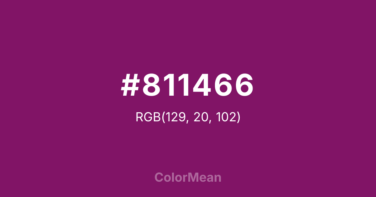 #811466 RGB value is (129, 20, 102). The hex color red value is 129, green is 20, and blue is 102. Its HSL format shows a hue of 315°, saturation of 73 percent, and lightness of 29 percent. The CMYK process values are 0 percent, 84 percent, 21 percent, 49 percent.
