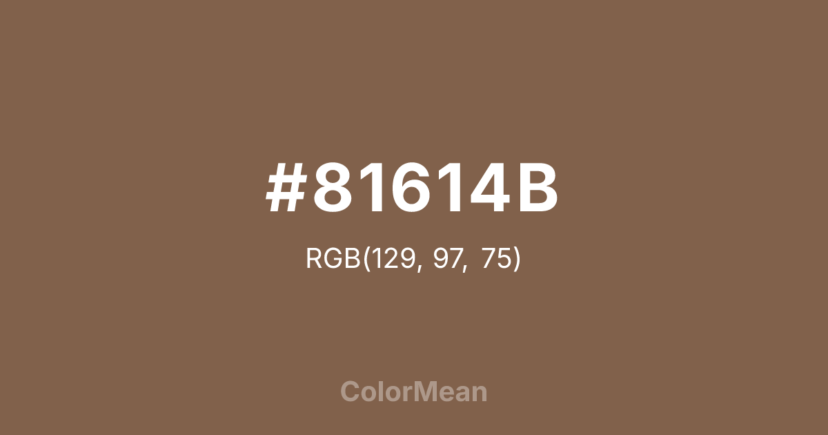 #81614B RGB value is (129, 97, 75). The hex color red value is 129, green is 97, and blue is 75. Its HSL format shows a hue of 24°, saturation of 26 percent, and lightness of 40 percent. The CMYK process values are 0 percent, 25 percent, 42 percent, 49 percent.