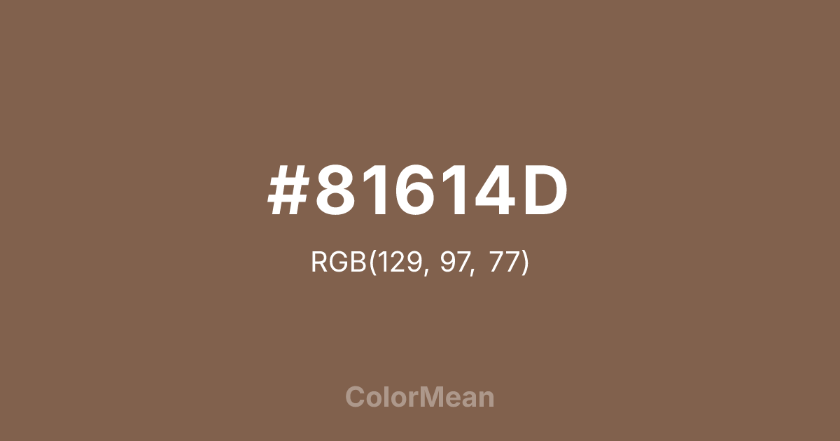 #81614D RGB value is (129, 97, 77). The hex color red value is 129, green is 97, and blue is 77. Its HSL format shows a hue of 23°, saturation of 25 percent, and lightness of 40 percent. The CMYK process values are 0 percent, 25 percent, 40 percent, 49 percent.