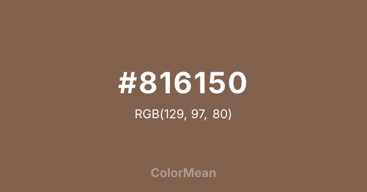 #816150 RGB value is (129, 97, 80). The hex color red value is 129, green is 97, and blue is 80. Its HSL format shows a hue of 21°, saturation of 23 percent, and lightness of 41 percent. The CMYK process values are 0 percent, 25 percent, 38 percent, 49 percent.