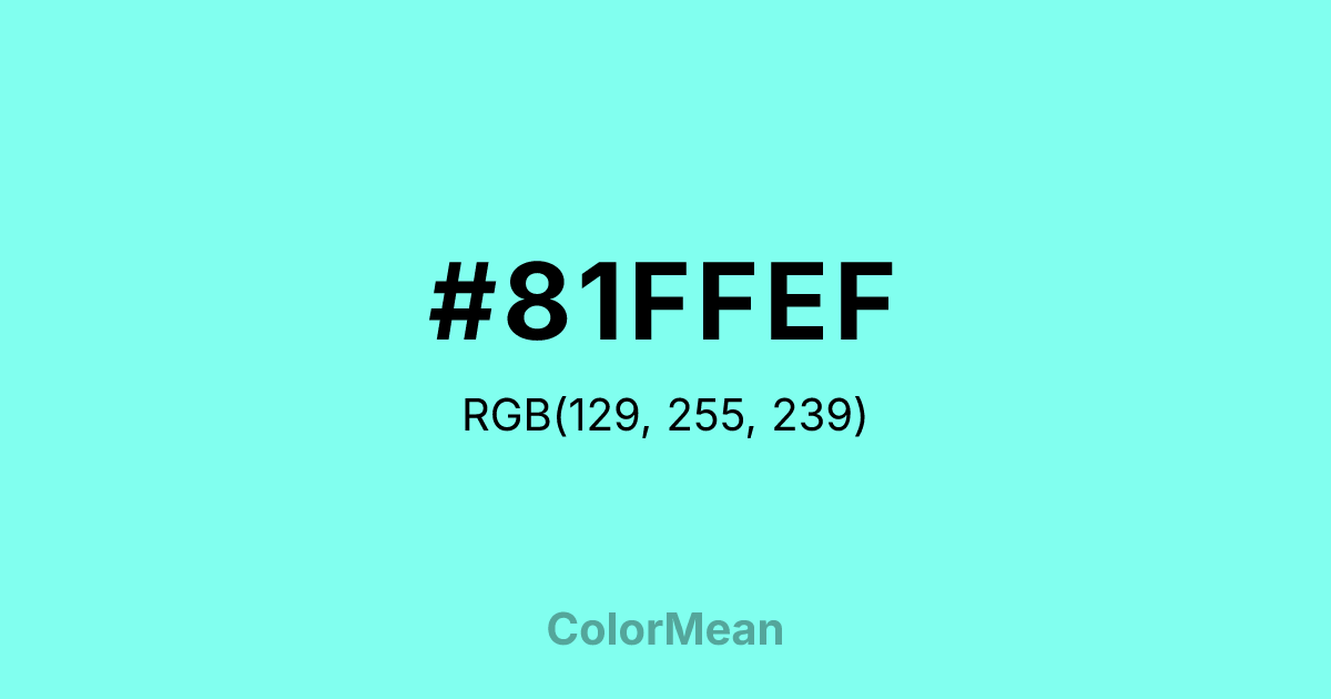 #81FFEF RGB value is (129, 255, 239). The hex color red value is 129, green is 255, and blue is 239. Its HSL format shows a hue of 172°, saturation of 100 percent, and lightness of 75 percent. The CMYK process values are 49 percent, 0 percent, 6 percent, 0 percent.