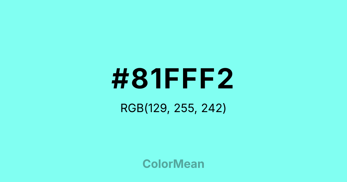 #81FFF2 RGB value is (129, 255, 242). The hex color red value is 129, green is 255, and blue is 242. Its HSL format shows a hue of 174°, saturation of 100 percent, and lightness of 75 percent. The CMYK process values are 49 percent, 0 percent, 5 percent, 0 percent.