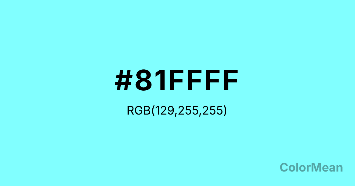 #81FFFF RGB value is (129, 255, 255). The hex color red value is 129, green is 255, and blue is 255. Its HSL format shows a hue of 180°, saturation of 100 percent, and lightness of 75 percent. The CMYK process values are 49 percent, 0 percent, 0 percent, 0 percent.