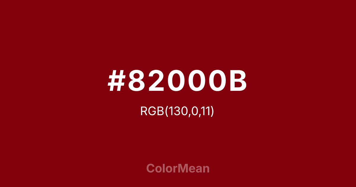 #82000B RGB value is (130, 0, 11). The hex color red value is 130, green is 0, and blue is 11. Its HSL format shows a hue of 355°, saturation of 100 percent, and lightness of 25 percent. The CMYK process values are 0 percent, 100 percent, 92 percent, 49 percent.