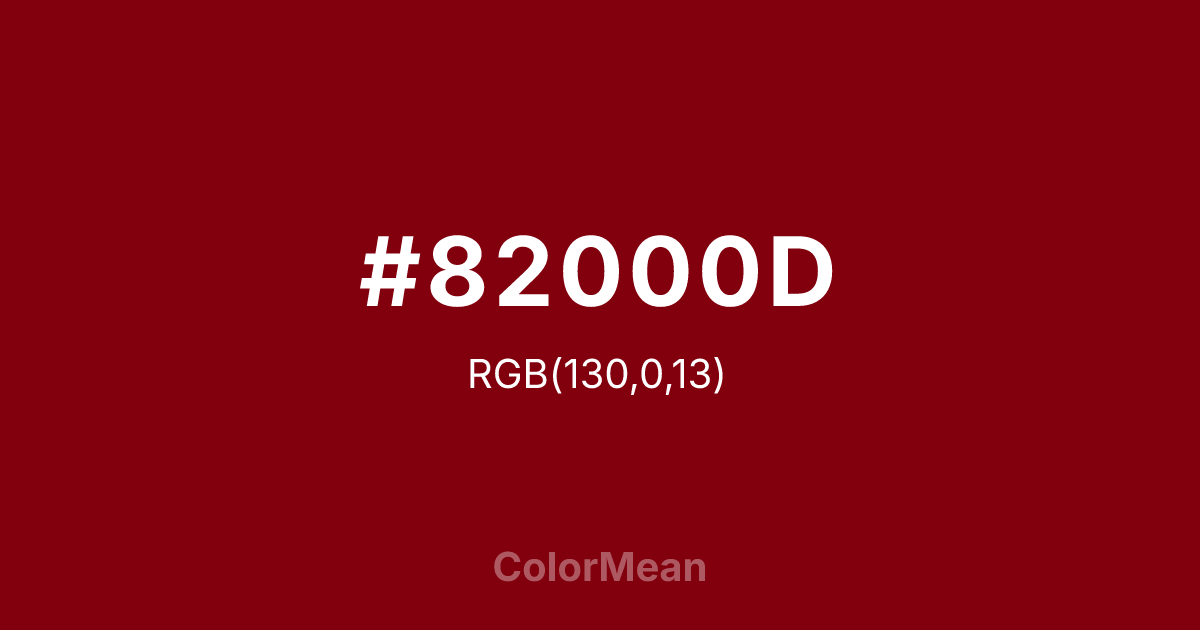 #82000D RGB value is (130, 0, 13). The hex color red value is 130, green is 0, and blue is 13. Its HSL format shows a hue of 354°, saturation of 100 percent, and lightness of 25 percent. The CMYK process values are 0 percent, 100 percent, 90 percent, 49 percent.