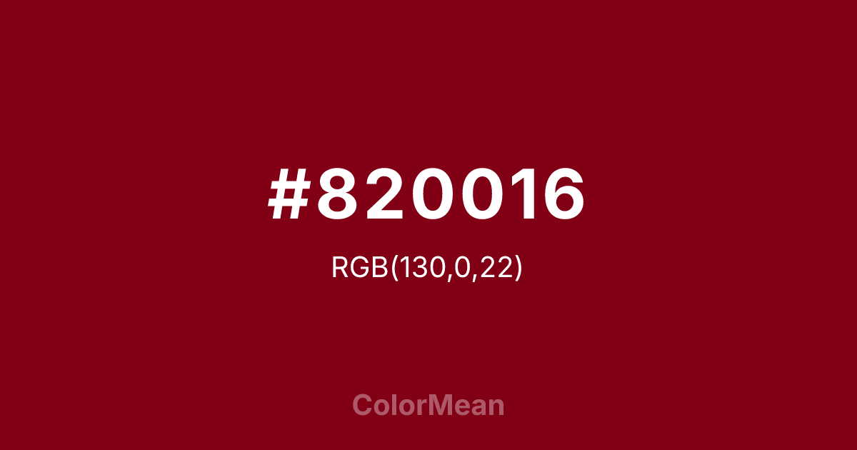 #820016 RGB value is (130, 0, 22). The hex color red value is 130, green is 0, and blue is 22. Its HSL format shows a hue of 350°, saturation of 100 percent, and lightness of 25 percent. The CMYK process values are 0 percent, 100 percent, 83 percent, 49 percent.