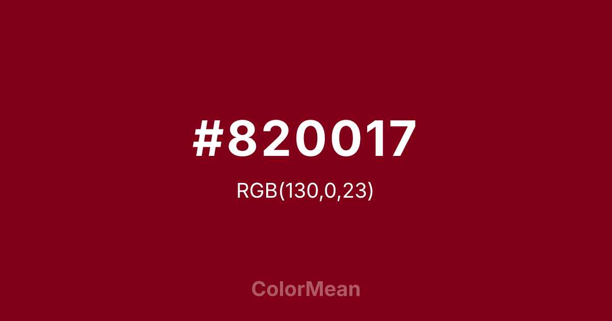 #820017 RGB value is (130, 0, 23). The hex color red value is 130, green is 0, and blue is 23. Its HSL format shows a hue of 349°, saturation of 100 percent, and lightness of 25 percent. The CMYK process values are 0 percent, 100 percent, 82 percent, 49 percent.