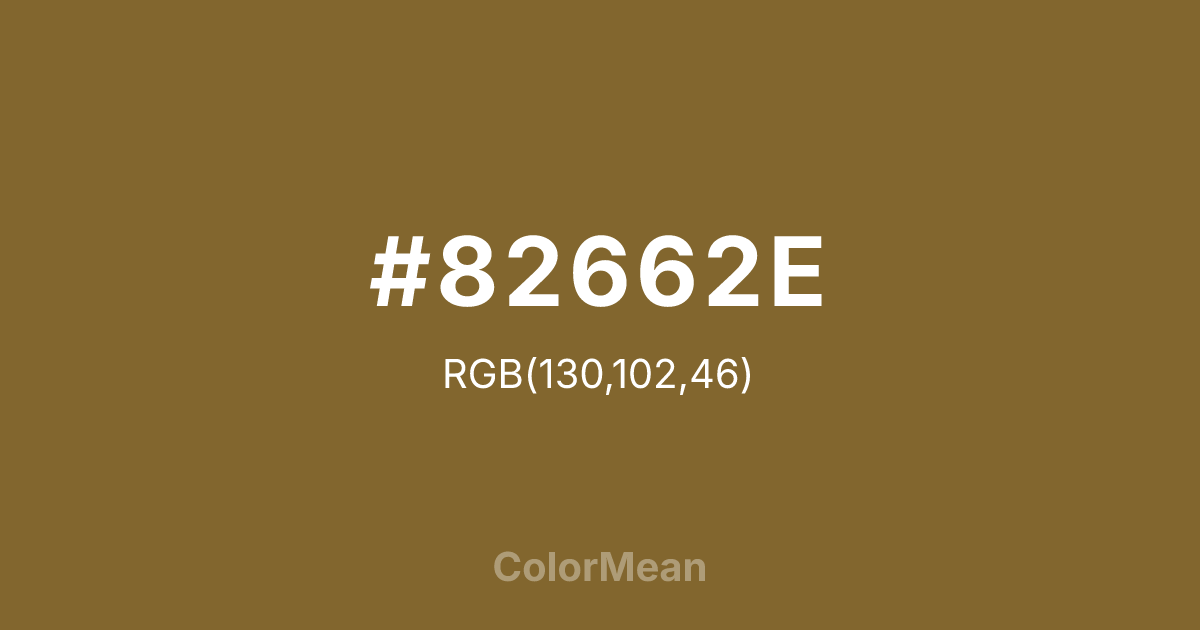 #82662E RGB value is (130, 102, 46). The hex color red value is 130, green is 102, and blue is 46. Its HSL format shows a hue of 40°, saturation of 48 percent, and lightness of 35 percent. The CMYK process values are 0 percent, 22 percent, 65 percent, 49 percent.