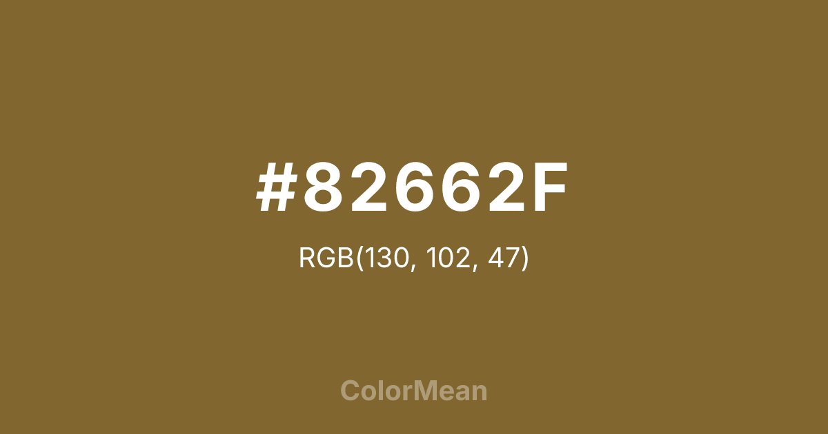 #82662F RGB value is (130, 102, 47). The hex color red value is 130, green is 102, and blue is 47. Its HSL format shows a hue of 40°, saturation of 47 percent, and lightness of 35 percent. The CMYK process values are 0 percent, 22 percent, 64 percent, 49 percent.