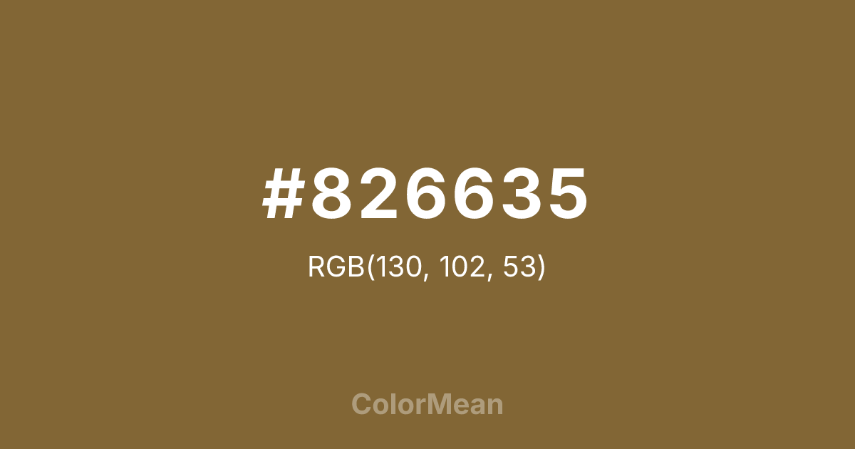 #826635 RGB value is (130, 102, 53). The hex color red value is 130, green is 102, and blue is 53. Its HSL format shows a hue of 38°, saturation of 42 percent, and lightness of 36 percent. The CMYK process values are 0 percent, 22 percent, 59 percent, 49 percent.