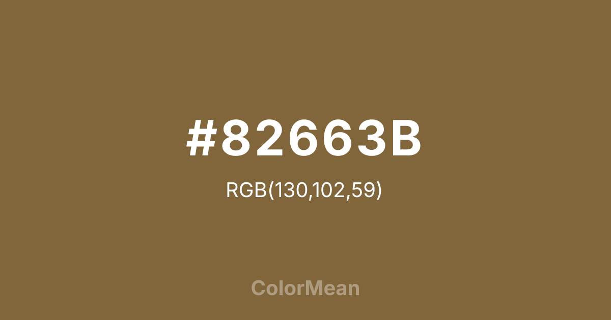 #82663B RGB value is (130, 102, 59). The hex color red value is 130, green is 102, and blue is 59. Its HSL format shows a hue of 36°, saturation of 38 percent, and lightness of 37 percent. The CMYK process values are 0 percent, 22 percent, 55 percent, 49 percent.