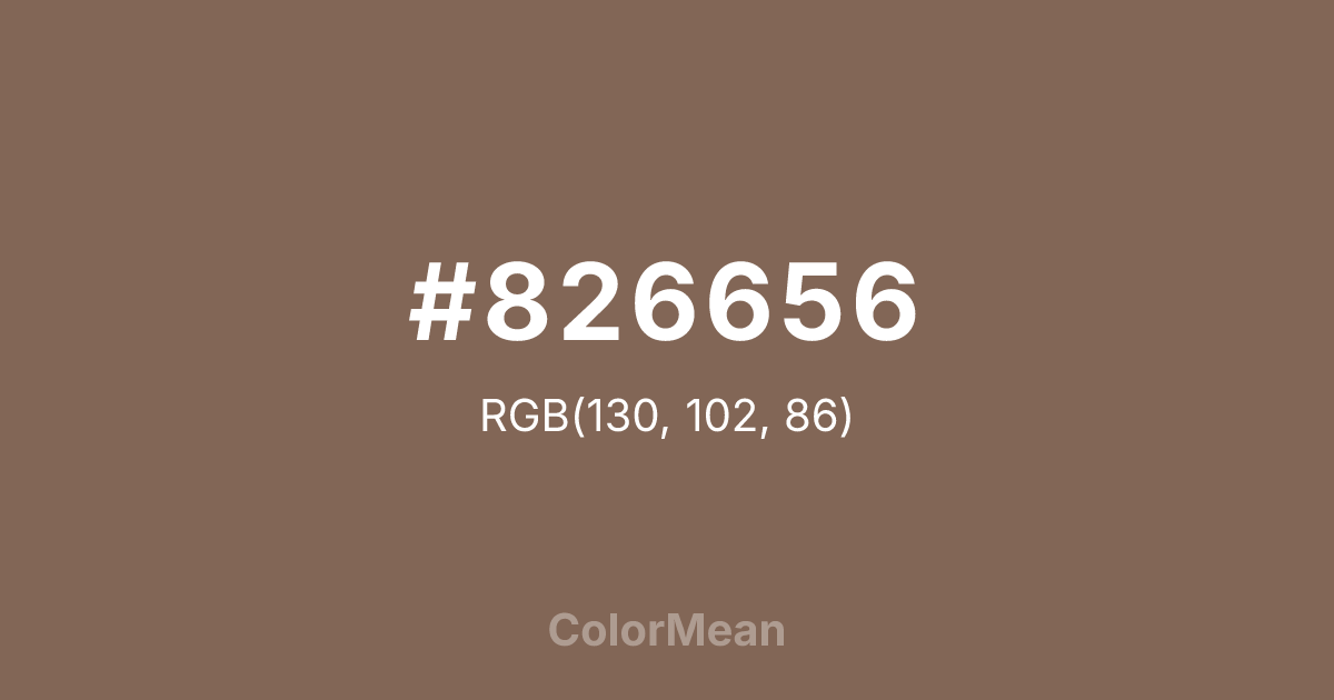 #826656 RGB value is (130, 102, 86). The hex color red value is 130, green is 102, and blue is 86. Its HSL format shows a hue of 22°, saturation of 20 percent, and lightness of 42 percent. The CMYK process values are 0 percent, 22 percent, 34 percent, 49 percent.
