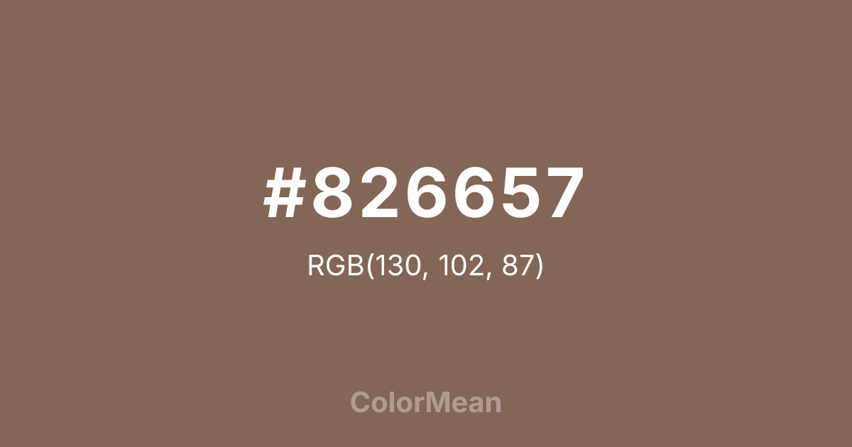#826657 RGB value is (130, 102, 87). The hex color red value is 130, green is 102, and blue is 87. Its HSL format shows a hue of 21°, saturation of 20 percent, and lightness of 43 percent. The CMYK process values are 0 percent, 22 percent, 33 percent, 49 percent.