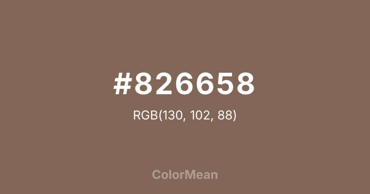 #826658 RGB value is (130, 102, 88). The hex color red value is 130, green is 102, and blue is 88. Its HSL format shows a hue of 20°, saturation of 19 percent, and lightness of 43 percent. The CMYK process values are 0 percent, 22 percent, 32 percent, 49 percent.
