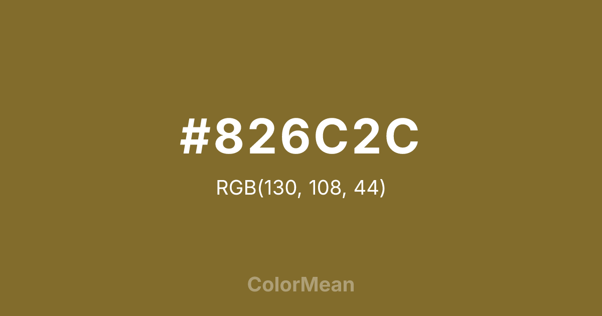 #826C2C RGB value is (130, 108, 44). The hex color red value is 130, green is 108, and blue is 44. Its HSL format shows a hue of 45°, saturation of 49 percent, and lightness of 34 percent. The CMYK process values are 0 percent, 17 percent, 66 percent, 49 percent.