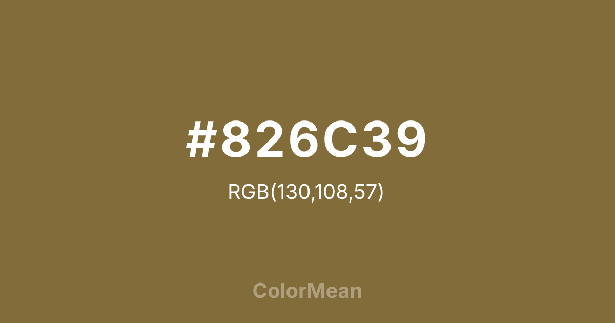 #826C39 RGB value is (130, 108, 57). The hex color red value is 130, green is 108, and blue is 57. Its HSL format shows a hue of 42°, saturation of 39 percent, and lightness of 37 percent. The CMYK process values are 0 percent, 17 percent, 56 percent, 49 percent.