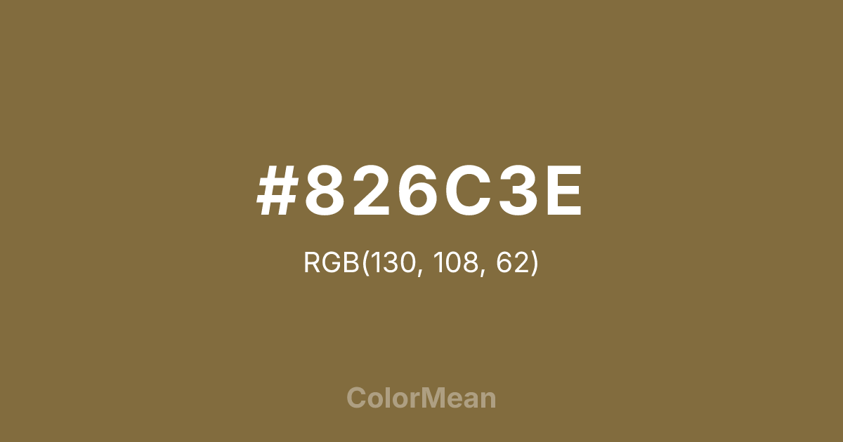 #826C3E RGB value is (130, 108, 62). The hex color red value is 130, green is 108, and blue is 62. Its HSL format shows a hue of 41°, saturation of 35 percent, and lightness of 38 percent. The CMYK process values are 0 percent, 17 percent, 52 percent, 49 percent.