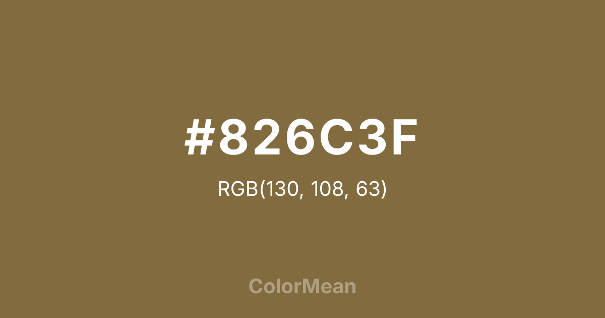 #826C3F RGB value is (130, 108, 63). The hex color red value is 130, green is 108, and blue is 63. Its HSL format shows a hue of 40°, saturation of 35 percent, and lightness of 38 percent. The CMYK process values are 0 percent, 17 percent, 52 percent, 49 percent.