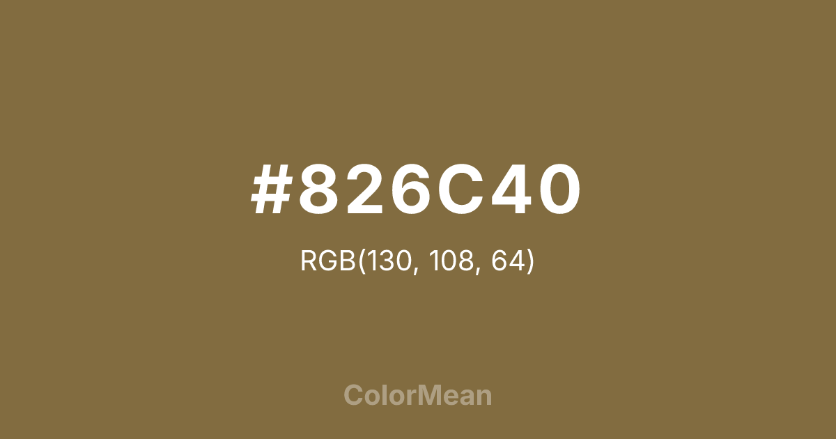 #826C40 RGB value is (130, 108, 64). The hex color red value is 130, green is 108, and blue is 64. Its HSL format shows a hue of 40°, saturation of 34 percent, and lightness of 38 percent. The CMYK process values are 0 percent, 17 percent, 51 percent, 49 percent.