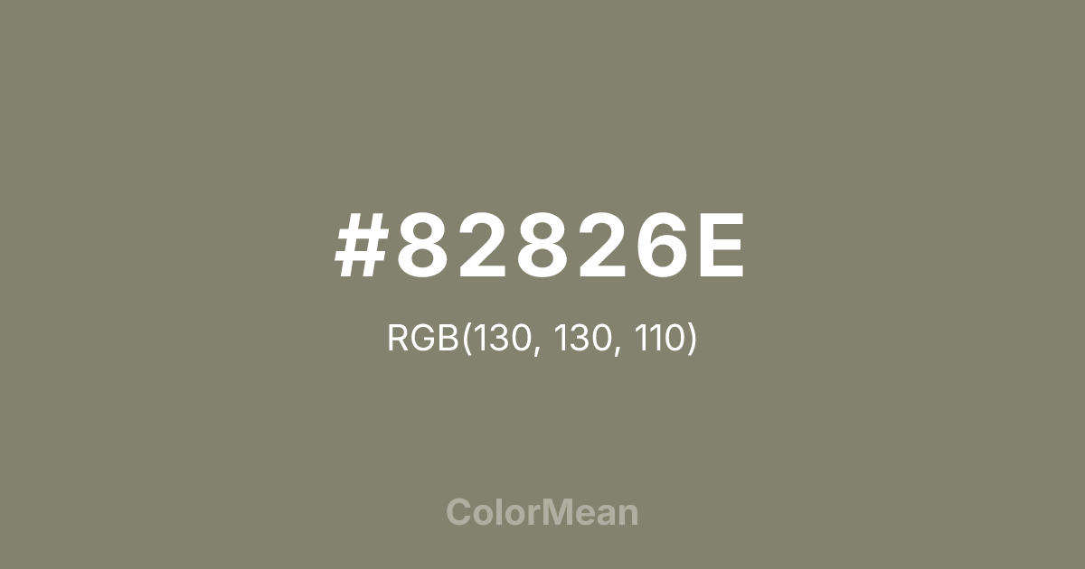 #82826E RGB value is (130, 130, 110). The hex color red value is 130, green is 130, and blue is 110. Its HSL format shows a hue of 60°, saturation of 8 percent, and lightness of 47 percent. The CMYK process values are 0 percent, 0 percent, 15 percent, 49 percent.