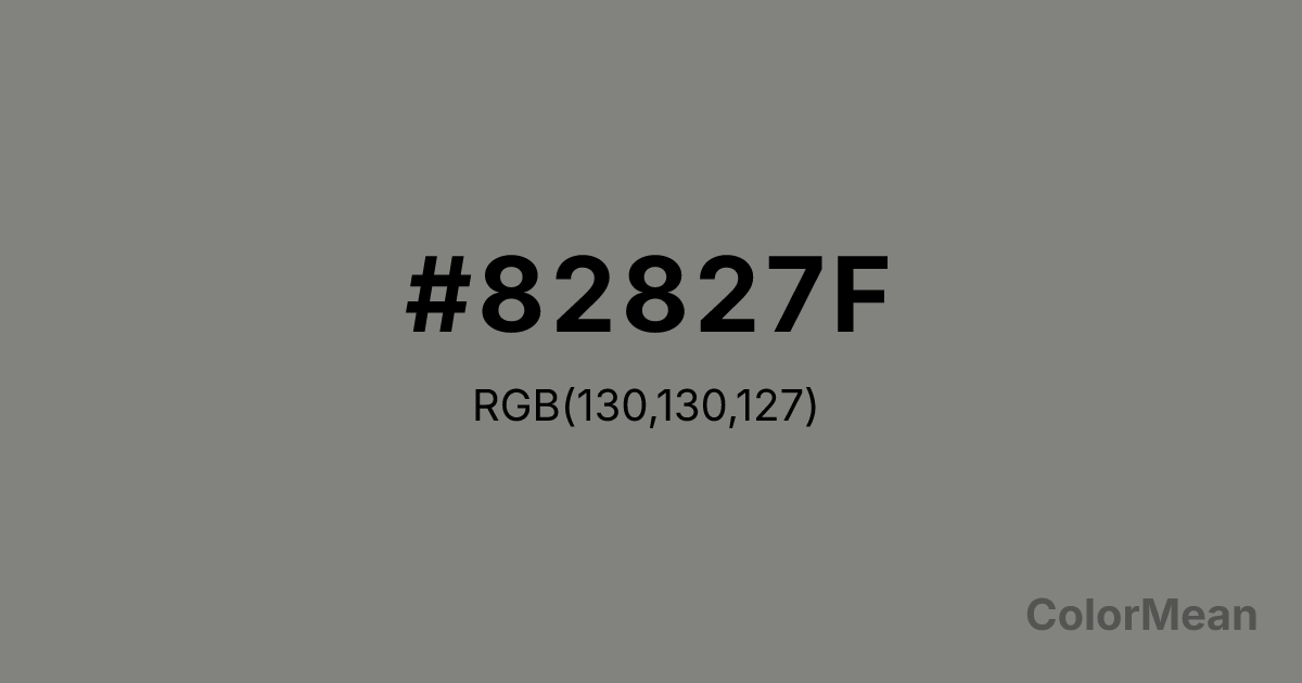 #82827F RGB value is (130, 130, 127). The hex color red value is 130, green is 130, and blue is 127. Its HSL format shows a hue of 60°, saturation of 1 percent, and lightness of 50 percent. The CMYK process values are 0 percent, 0 percent, 2 percent, 49 percent.