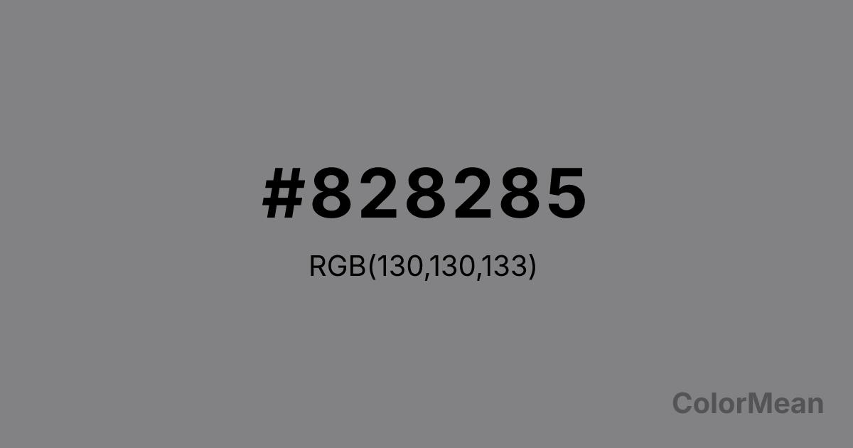 #828285 RGB value is (130, 130, 133). The hex color red value is 130, green is 130, and blue is 133. Its HSL format shows a hue of 240°, saturation of 1 percent, and lightness of 52 percent. The CMYK process values are 2 percent, 2 percent, 0 percent, 48 percent.
