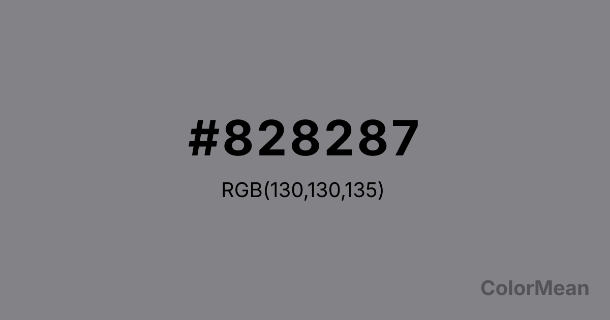 #828287 RGB value is (130, 130, 135). The hex color red value is 130, green is 130, and blue is 135. Its HSL format shows a hue of 240°, saturation of 2 percent, and lightness of 52 percent. The CMYK process values are 4 percent, 4 percent, 0 percent, 47 percent.