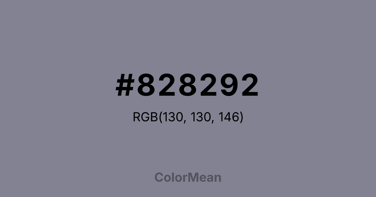 #828292 RGB value is (130, 130, 146). The hex color red value is 130, green is 130, and blue is 146. Its HSL format shows a hue of 240°, saturation of 7 percent, and lightness of 54 percent. The CMYK process values are 11 percent, 11 percent, 0 percent, 43 percent.