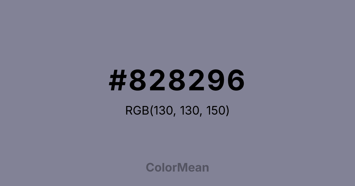 #828296 RGB value is (130, 130, 150). The hex color red value is 130, green is 130, and blue is 150. Its HSL format shows a hue of 240°, saturation of 9 percent, and lightness of 55 percent. The CMYK process values are 13 percent, 13 percent, 0 percent, 41 percent.
