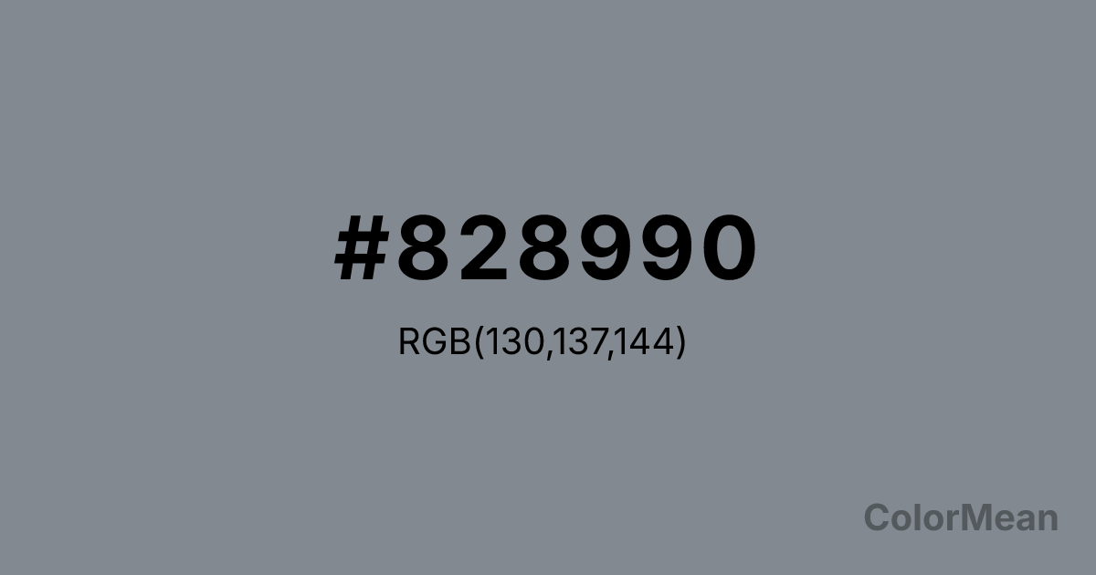 #828990 RGB value is (130, 137, 144). The hex color red value is 130, green is 137, and blue is 144. Its HSL format shows a hue of 210°, saturation of 6 percent, and lightness of 54 percent. The CMYK process values are 10 percent, 5 percent, 0 percent, 44 percent.