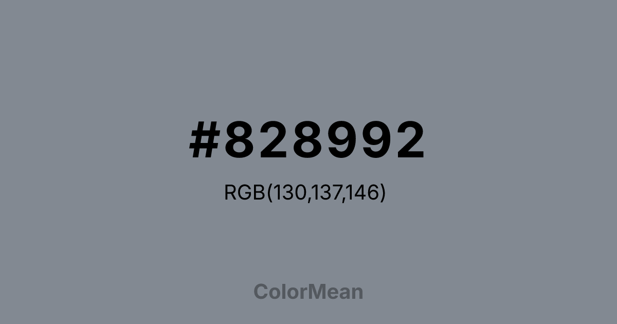 #828992 RGB value is (130, 137, 146). The hex color red value is 130, green is 137, and blue is 146. Its HSL format shows a hue of 214°, saturation of 7 percent, and lightness of 54 percent. The CMYK process values are 11 percent, 6 percent, 0 percent, 43 percent.