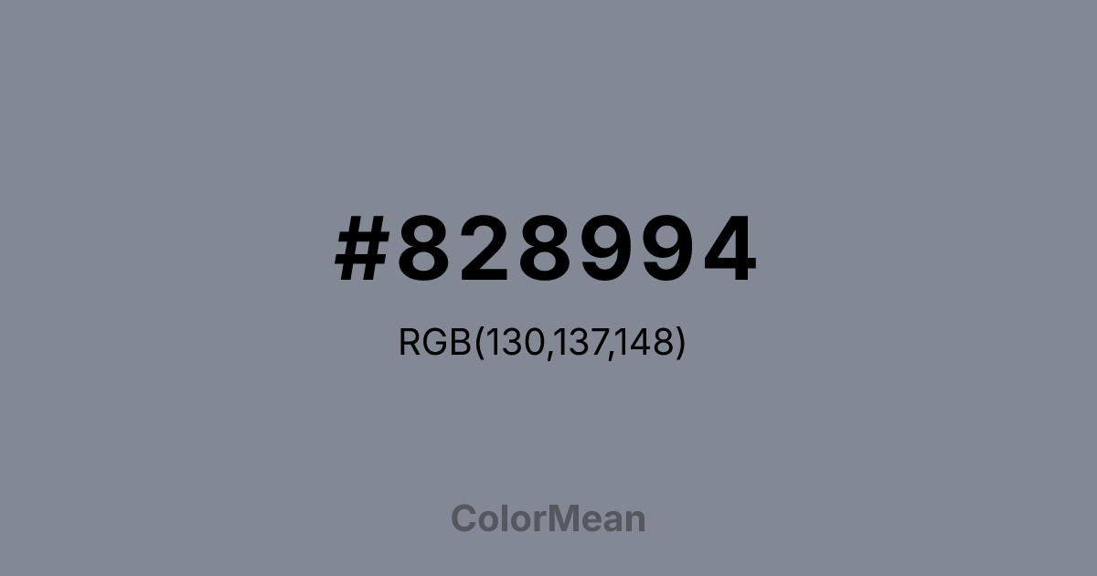 #828994 RGB value is (130, 137, 148). The hex color red value is 130, green is 137, and blue is 148. Its HSL format shows a hue of 217°, saturation of 8 percent, and lightness of 55 percent. The CMYK process values are 12 percent, 7 percent, 0 percent, 42 percent.