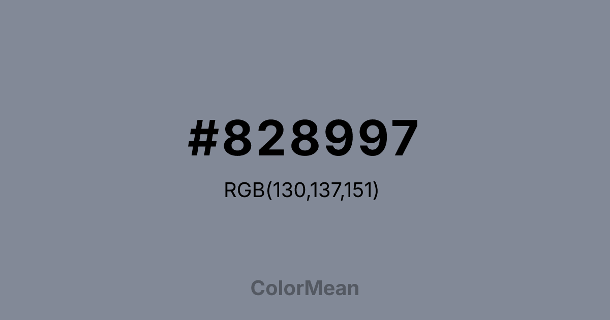 #828997 RGB value is (130, 137, 151). The hex color red value is 130, green is 137, and blue is 151. Its HSL format shows a hue of 220°, saturation of 9 percent, and lightness of 55 percent. The CMYK process values are 14 percent, 9 percent, 0 percent, 41 percent.