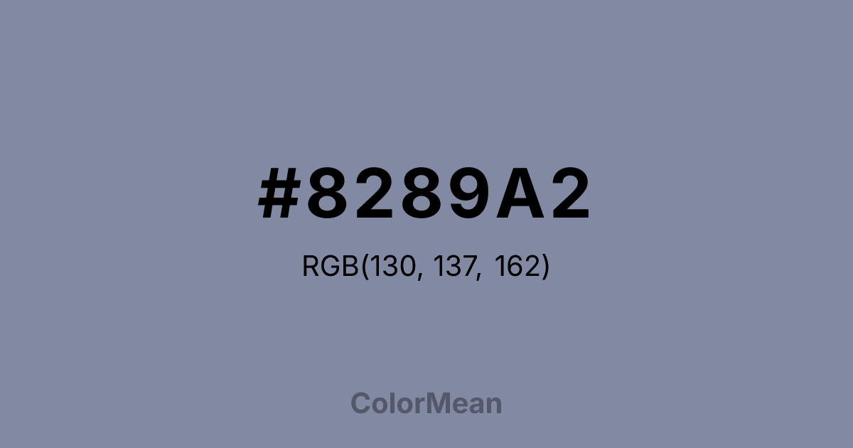 #8289A2 RGB value is (130, 137, 162). The hex color red value is 130, green is 137, and blue is 162. Its HSL format shows a hue of 227°, saturation of 15 percent, and lightness of 57 percent. The CMYK process values are 20 percent, 15 percent, 0 percent, 36 percent.