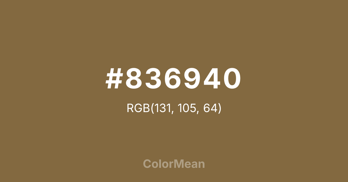 #836940 RGB value is (131, 105, 64). The hex color red value is 131, green is 105, and blue is 64. Its HSL format shows a hue of 37°, saturation of 34 percent, and lightness of 38 percent. The CMYK process values are 0 percent, 20 percent, 51 percent, 49 percent.