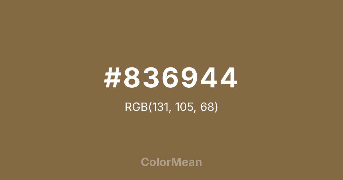 #836944 RGB value is (131, 105, 68). The hex color red value is 131, green is 105, and blue is 68. Its HSL format shows a hue of 35°, saturation of 32 percent, and lightness of 39 percent. The CMYK process values are 0 percent, 20 percent, 48 percent, 49 percent.