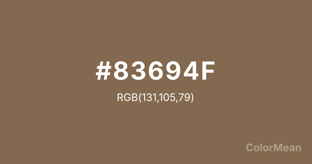 #83694F RGB value is (131, 105, 79). The hex color red value is 131, green is 105, and blue is 79. Its HSL format shows a hue of 30°, saturation of 25 percent, and lightness of 41 percent. The CMYK process values are 0 percent, 20 percent, 40 percent, 49 percent.