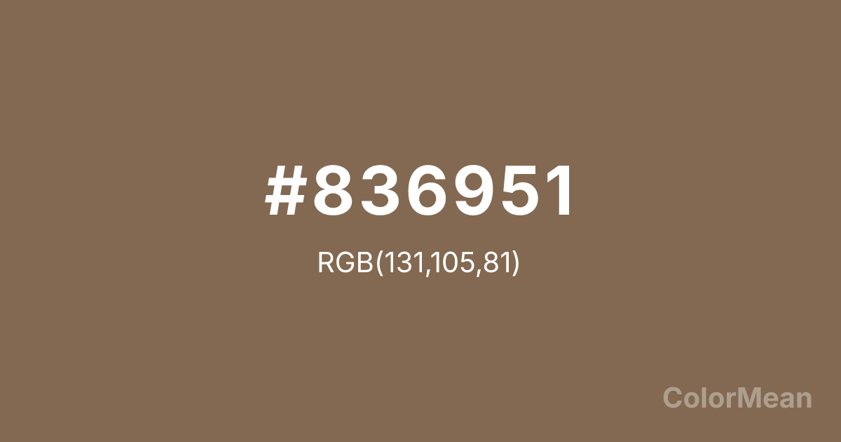 #836951 RGB value is (131, 105, 81). The hex color red value is 131, green is 105, and blue is 81. Its HSL format shows a hue of 29°, saturation of 24 percent, and lightness of 42 percent. The CMYK process values are 0 percent, 20 percent, 38 percent, 49 percent.