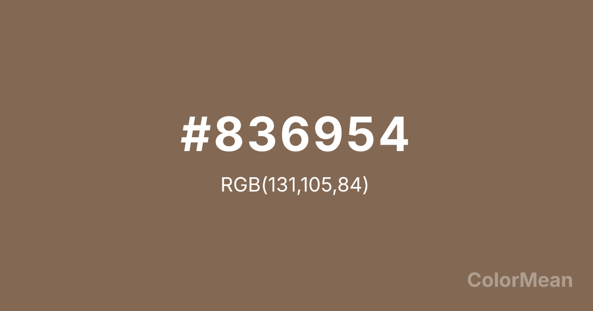 #836954 RGB value is (131, 105, 84). The hex color red value is 131, green is 105, and blue is 84. Its HSL format shows a hue of 27°, saturation of 22 percent, and lightness of 42 percent. The CMYK process values are 0 percent, 20 percent, 36 percent, 49 percent.