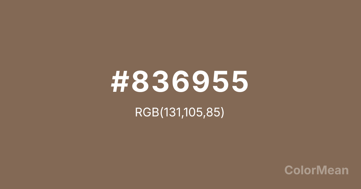 #836955 RGB value is (131, 105, 85). The hex color red value is 131, green is 105, and blue is 85. Its HSL format shows a hue of 26°, saturation of 21 percent, and lightness of 42 percent. The CMYK process values are 0 percent, 20 percent, 35 percent, 49 percent.