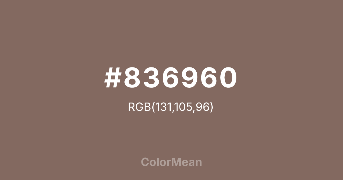 #836960 RGB value is (131, 105, 96). The hex color red value is 131, green is 105, and blue is 96. Its HSL format shows a hue of 15°, saturation of 15 percent, and lightness of 45 percent. The CMYK process values are 0 percent, 20 percent, 27 percent, 49 percent.