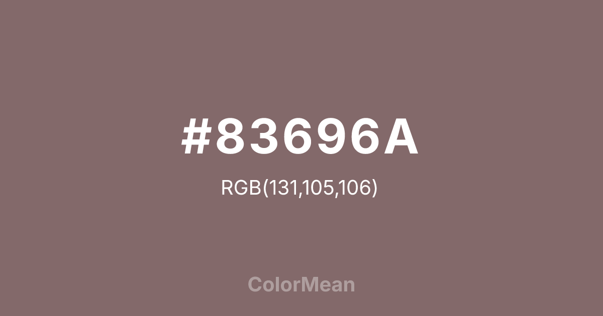 #83696A RGB value is (131, 105, 106). The hex color red value is 131, green is 105, and blue is 106. Its HSL format shows a hue of 358°, saturation of 11 percent, and lightness of 46 percent. The CMYK process values are 0 percent, 20 percent, 19 percent, 49 percent.