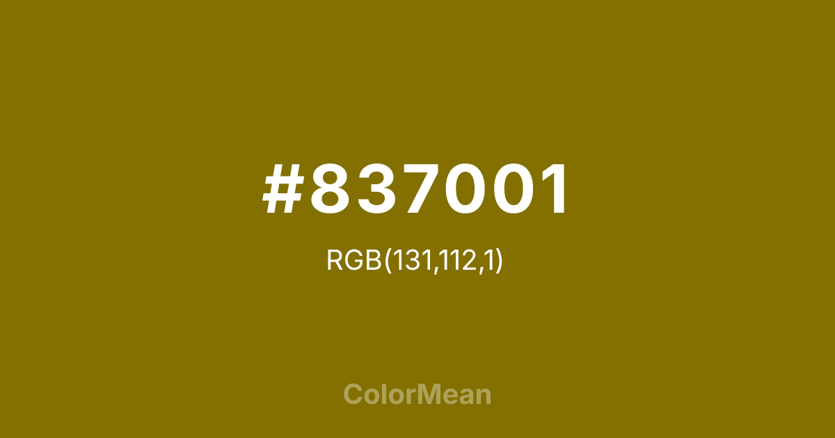 #837001 RGB value is (131, 112, 1). The hex color red value is 131, green is 112, and blue is 1. Its HSL format shows a hue of 51°, saturation of 98 percent, and lightness of 26 percent. The CMYK process values are 0 percent, 15 percent, 99 percent, 49 percent.