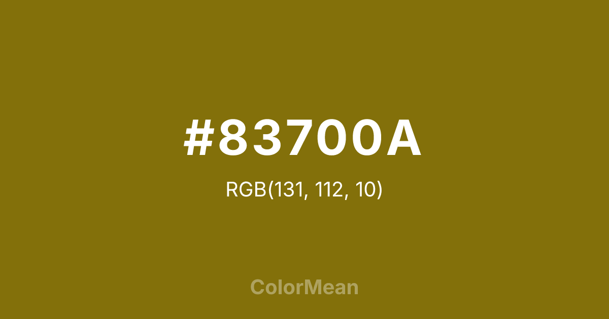 #83700A RGB value is (131, 112, 10). The hex color red value is 131, green is 112, and blue is 10. Its HSL format shows a hue of 51°, saturation of 86 percent, and lightness of 28 percent. The CMYK process values are 0 percent, 15 percent, 92 percent, 49 percent.