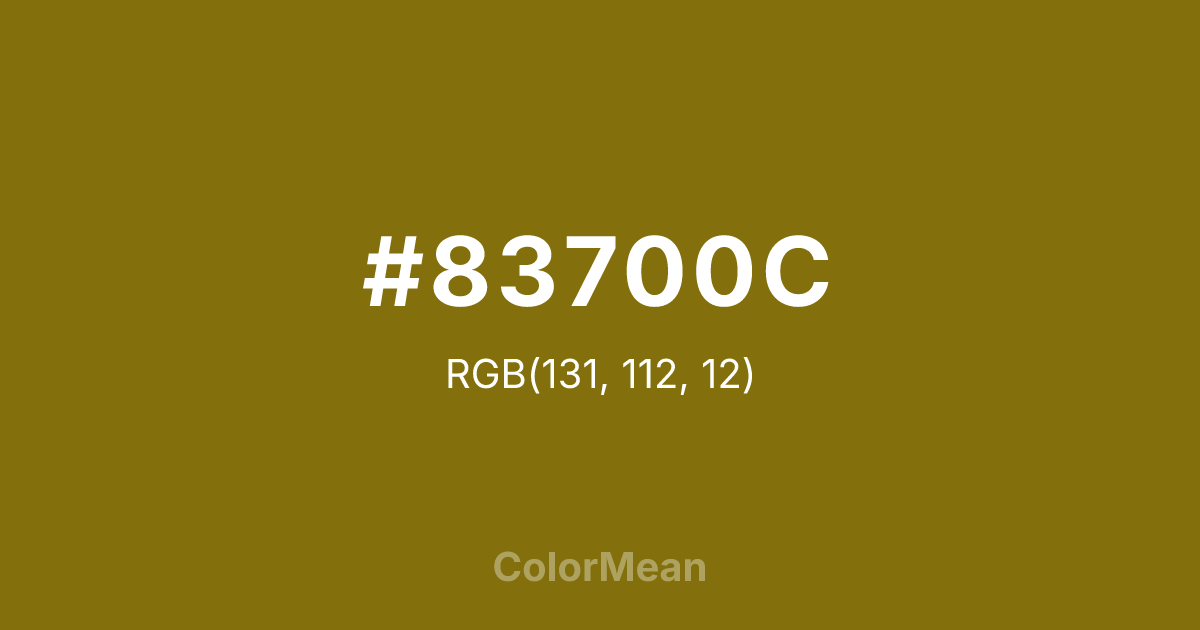 #83700C RGB value is (131, 112, 12). The hex color red value is 131, green is 112, and blue is 12. Its HSL format shows a hue of 50°, saturation of 83 percent, and lightness of 28 percent. The CMYK process values are 0 percent, 15 percent, 91 percent, 49 percent.