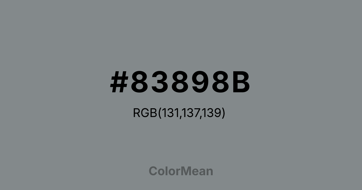 #83898B RGB value is (131, 137, 139). The hex color red value is 131, green is 137, and blue is 139. Its HSL format shows a hue of 195°, saturation of 3 percent, and lightness of 53 percent. The CMYK process values are 6 percent, 1 percent, 0 percent, 45 percent.